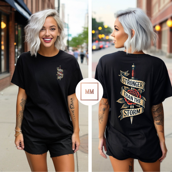 This Stronger Than The Storm Tee boasts a unique rose and tattoo style design, making it a standout addition to any wardrobe. With its eye-catching details, this tee is sure to make a bold statement and inspire strength and resilience in those who wear it.