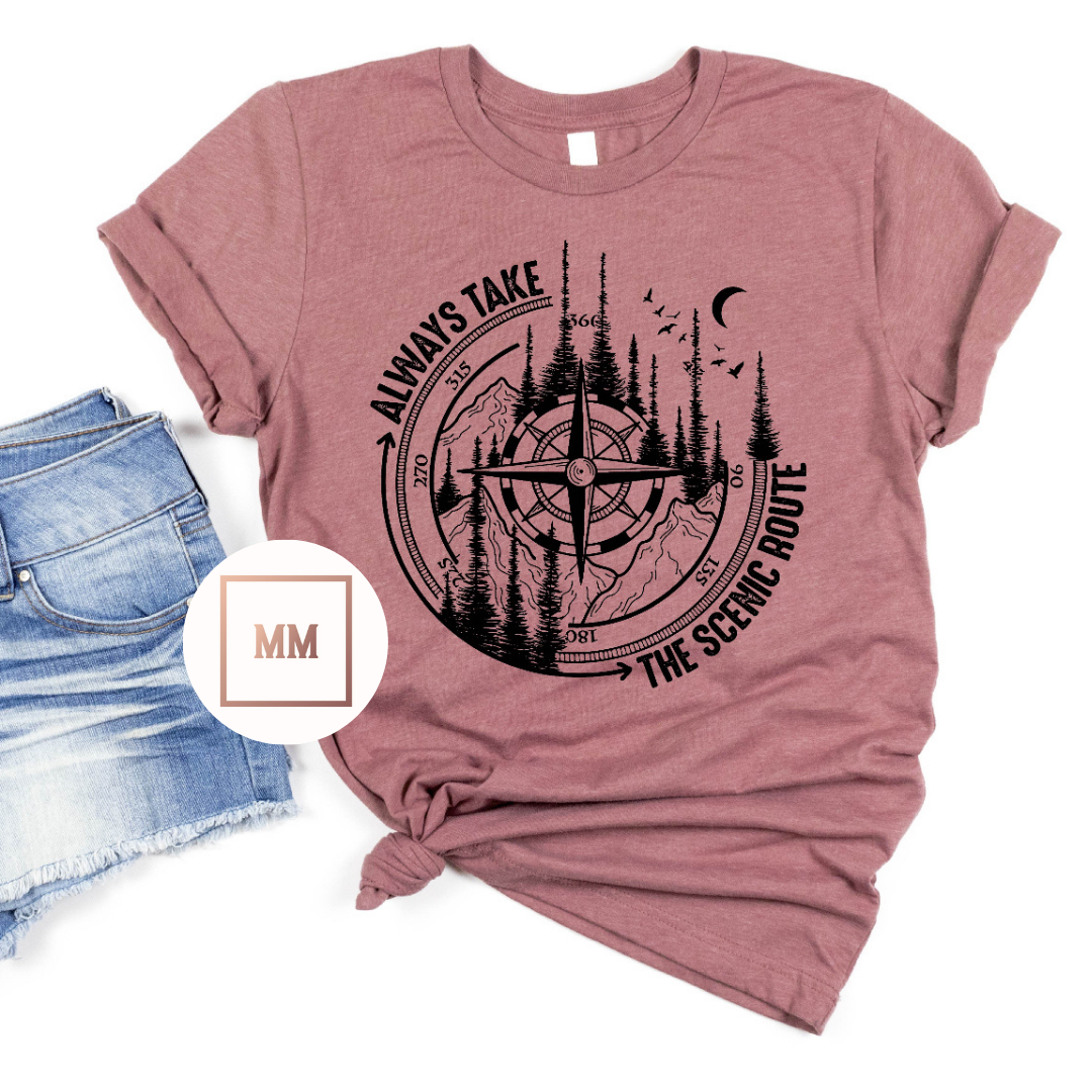 Explore new paths and enjoy the journey with our "Take the Scenic Route Tee". The compass print encourages you to always seek new adventures and experience the beauty of nature. Embrace your wanderlust with this comfortable and stylish tee.