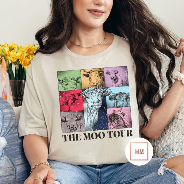 Discover the Moo Tour Tee, featuring an informative design of 7 cows. Perfect for any cow-lover, this tee is made with high-quality materials for maximum comfort and durability. Join the tour and showcase your love for cows in style.