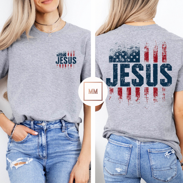 Experience the ultimate expression of American pride with our USA Jesus Tee. Featuring a bold USA flag design and the name of Jesus in large letters, this tee is perfect for showing off your devotion to both your country and your faith. Show the world what it means to be a true patriot with this unique and powerful tee.