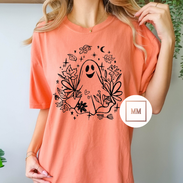 Introducing the Whimsy Ghosty Tee, a playful and unique addition to your wardrobe. This tee features a friendly ghost playing in leaves, adding a touch of whimsy to any outfit. Made with high-quality fabric, this tee is not only stylish but also comfortable. Perfect for those who love to add a touch of fun to their fashion.