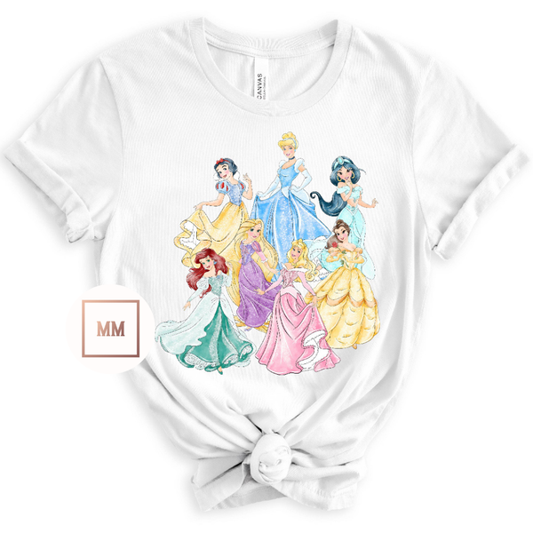 Elevate your style with our comfy White Pretty Princess Tee. Featuring 7 of their favorite princesses in stunning gowns, this tee is sure to impress. Made from high-quality materials, it's both stylish and comfortable. Perfect for any princess-lover.