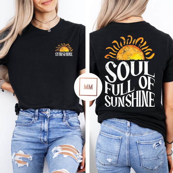 Experience the uplifting power of our White Writing Soul Full of Sunshine Tee. With its good vibes, kind spirit, and bright design, this shirt will surely make you feel like your soul is overflowing with sunshine. Spread positivity and style with every wear.