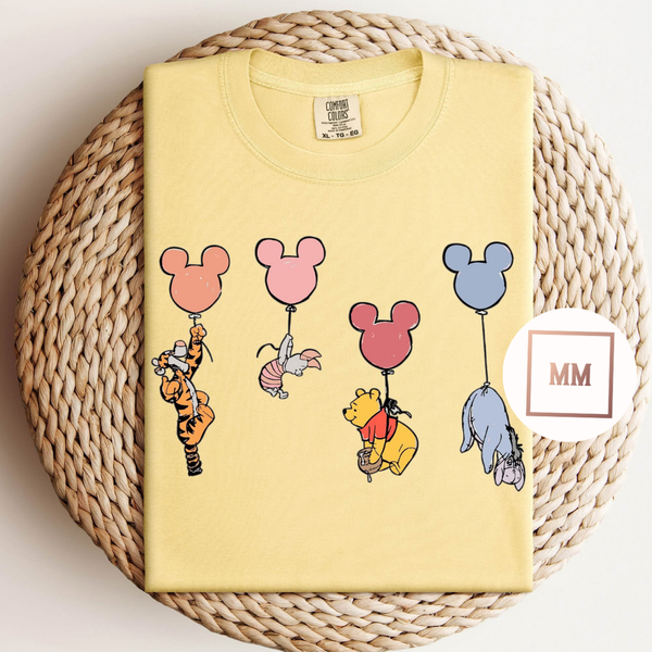 Introducing the Yellow WTP Tee. This playful tee features your favorite characters - bear, pig, tiger, and donkey - floating on colorful balloons. Made with high-quality cotton, this tee is fun and comfortable. Perfect for any fan!