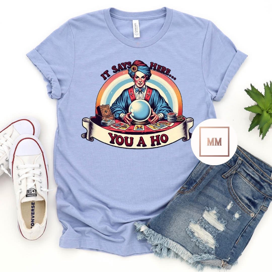 Introducing You a Ho Tee! This unique shirt features a crystal ball and tarot cards, perfect for those interested in fortune telling and self-discovery. This tee is sure to intrigue and delight. Made with high-quality materials for ultimate comfort.
