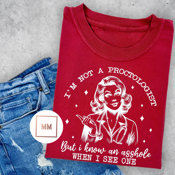 Enhance your wardrobe with our Not a Proctologist Tee! This tee boasts a clever phrase that showcases your expertise in identifying individuals who are, well, assholes. Perfect for casual wear or for making a statement, this tee is a must-have for any witty and confident individual.