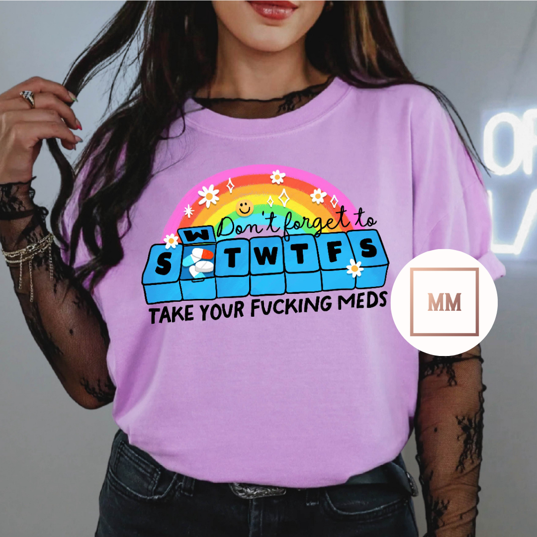 Stay on top of your health with our Take Your Meds Tee. Made with a rainbow design to remind you to take your medication, because your well-being is important. So don't forget to take your f*cking meds, and let this tee be a helpful visual reminder.