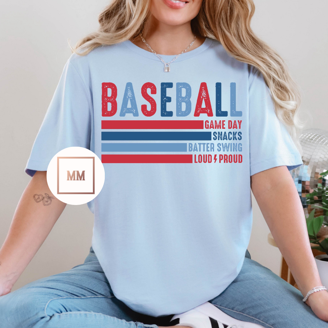 Made for game day, this Baseball Tee is perfect for cheering on your favorite team while indulging in snacks. With a comfortable fit and a loud & proud design, you'll be ready to swing for the fences and show your support in style.