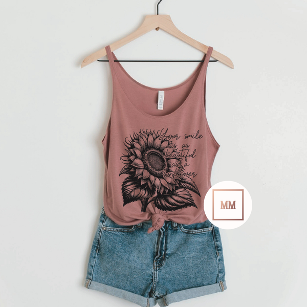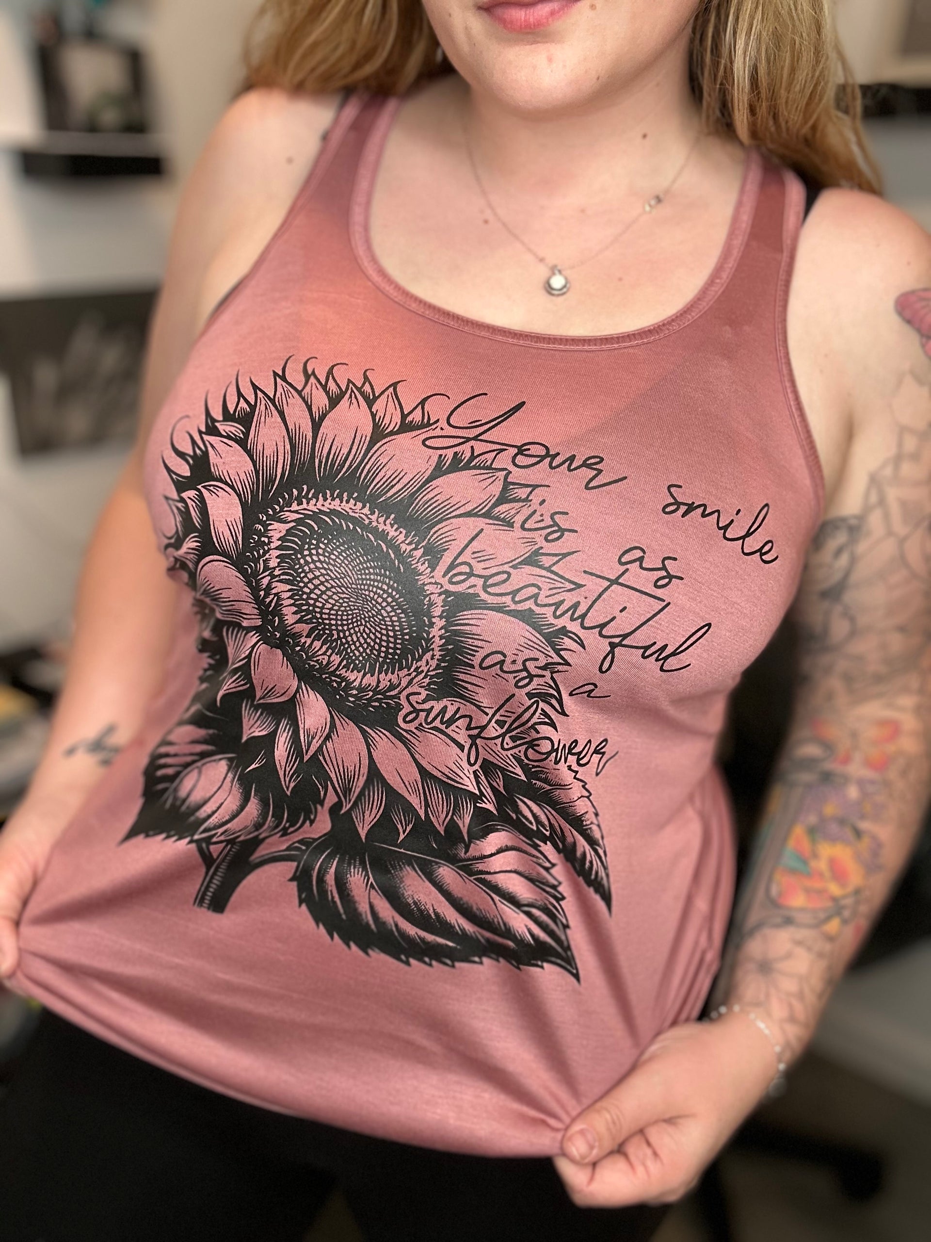 This soft and comfortable tand features a beautiful sunflower design and a meaningful phrase, making it the perfect addition to your wardrobe. Show off your sunny personality and spread joy wherever you go with this As Beautiful As A Sunflower Tank.