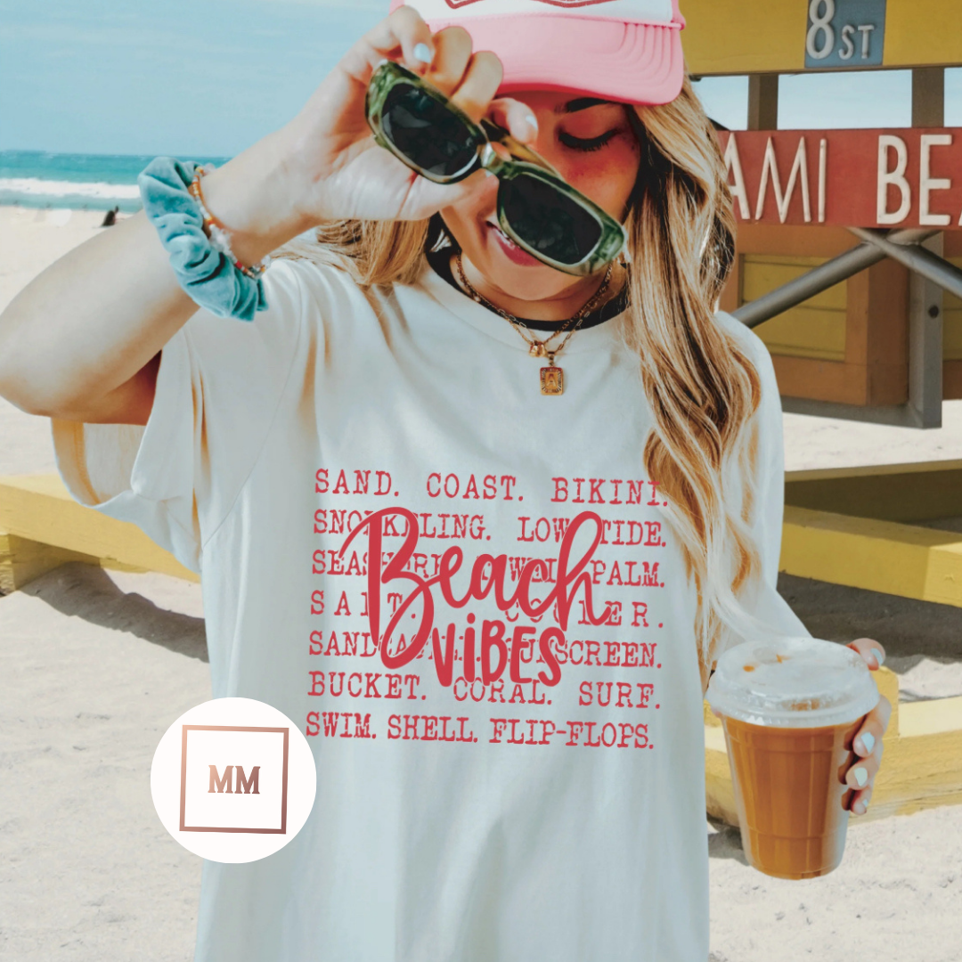 Introducing the Beach Vibes Tee, perfect for embracing summer vibes. This lightweight tee features beach-inspired words, making it the ideal choice for a day at the beach. Stay cool and stylish with this must-have piece for your summer wardrobe.