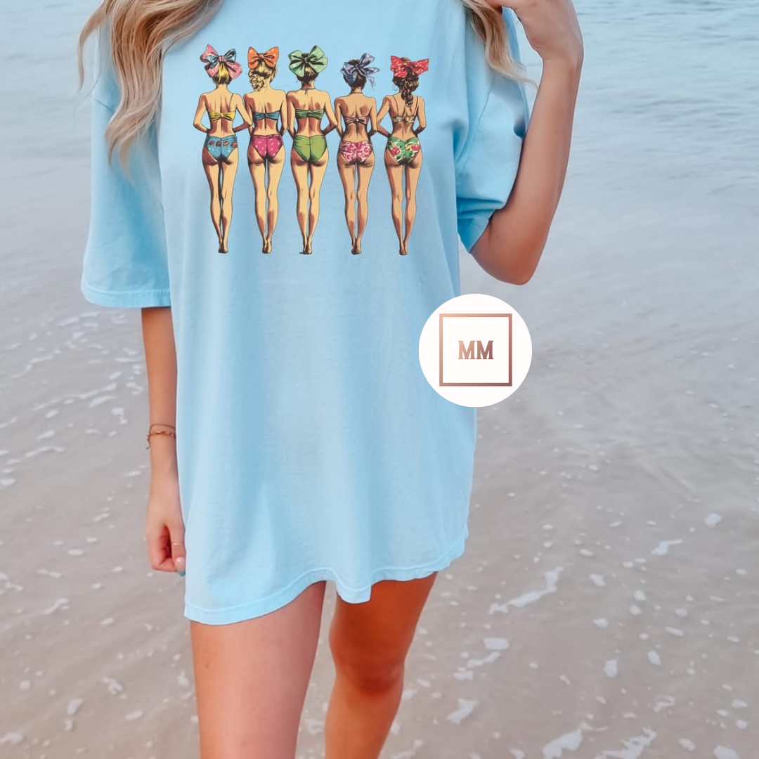 Experience the ultimate in retro style with our Bikini Babes Tee. Featuring five stunning beauties in vintage bikinis, this fun tee is a must-have for any fashion-forward individual. Channel the nostalgia of summers past and make a statement with this unique piece.