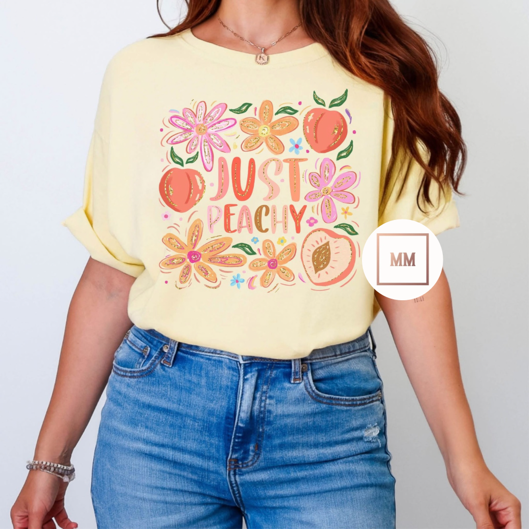 Our Just Peachy Tee is perfect for those warm summer months with its refreshing peach design. Made with a juicy peach print, this tee is both stylish and comfortable. Bring a taste of summer wherever you go with our Just Peachy Tee.
