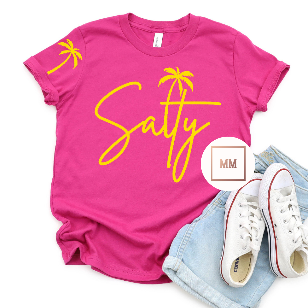 Add a touch of tropical paradise to your wardrobe with our Salty Tee. This pink tee features a subtle palm tree accent on the sleeve, bringing a unique and stylish twist to your everyday look. Made from high-quality materials, this tee will provide both comfort and style. Perfect for any casual occasion.