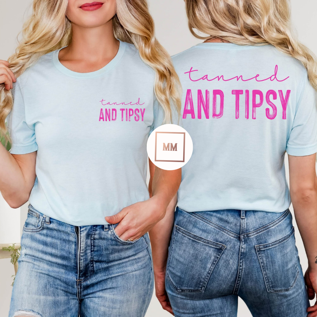 Designed for the perfect summer look, the Tanned and Tipsy Tee will have you feeling stylish and carefree. With a front pocket print and back print, this tee is the perfect addition to your wardrobe. Embrace the warm weather with confidence and style in this must-have shirt.