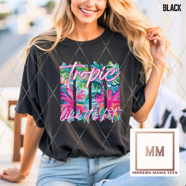 Infuse tropical vibes into your wardrobe with our Tropics Like It's Hot Tee. Featuring vibrant colors and a playful play on words, this tee is sure to make a statement. Perfect for any warm weather occasion, it's the must-have addition to your summer collection.