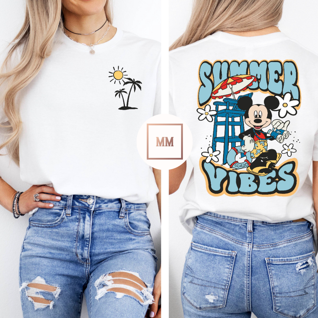 Expertly crafted for the ultimate summer vibes, our White Mick Tee features a cool palm tree and sunny design on the front pocket, with a charming mouse lifeguard on the back. Perfect for warm weather adventures, this tee is made to keep you stylish and comfortable all season long.