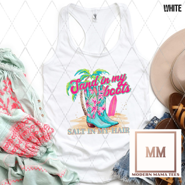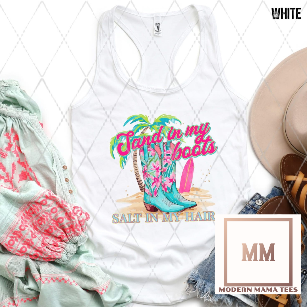 Experience the ultimate beach vibe with our Sand in my Boots Tank. Let the sand in your boots and salt in your hair transport you to the beach, while our tank top embraces the carefree spirit of the beach. Get ready for a day filled with sun, sand, and waves.