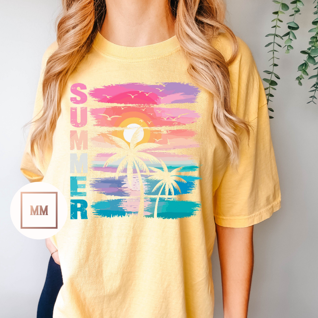 Introducing our Summer Palm Tree Tee, the perfect addition to your warm weather wardrobe. Made with relaxing colors and a summery palm tree design, this shirt will transport you to the beach with every wear. Don't miss out on this must-have piece for any beach lover.